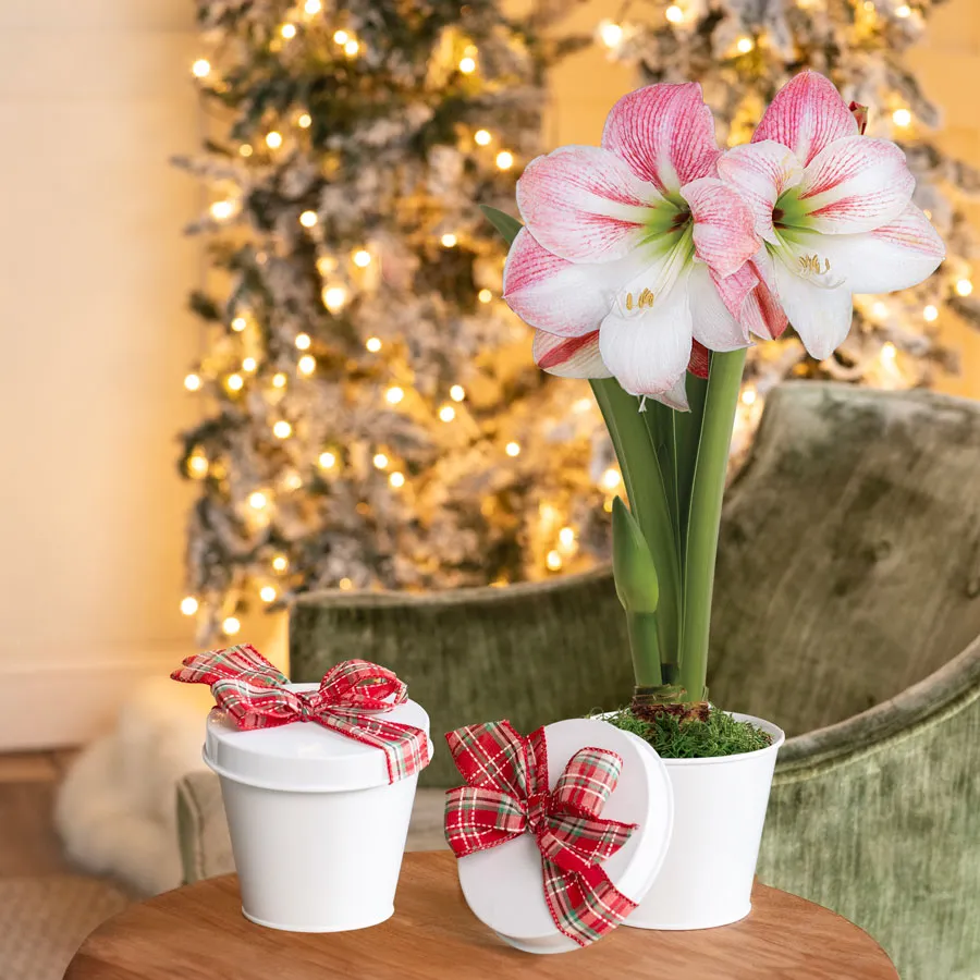 Share the joy of the holidays with the DIY Amaryllis Gift Set Apple Blossom Flower Bulb. This ingenious gift includes one raw Apple Blossom amaryllis bulb and a stylish white container, providing everything you need to grow your own beautiful amaryllis flowers. The bulb can be planted directly in the container provided or in your own favorite pot.