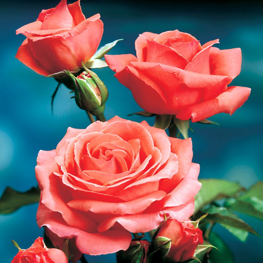 America Climbing Rose begins its show with masses of pointed buds, which open to layers of sunset-toned petals. Expect the flowers to reach 4 to 5 inches wide, borne primarily one per stem, but occasionally in small clusters. Banked by thick, leathery foliage that looks good from spring until hard frost in fall, the blooms appear in waves all season long, perfuming the garden around them, adding stunning color to any sunny setting, whether climbing an arch or arbor, trailing along a fence, covering a wall, or transforming a pergola or gazebo into a fragrant, shady retreat.