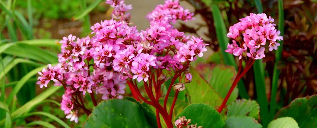 Spring: Bergenia blooms with clusters of bright pink or red flowers that stand tall above the glossy, heart-shaped leaves.