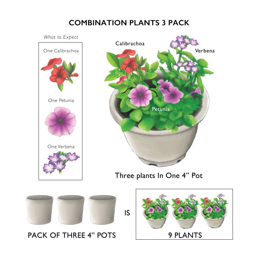 We have set one plant of each type into every 4-inch pot, so the Coleus and Sweet Potato Vines grow up and through one another, creating a "pre-mixed" combination of colors and forms you will love. You only need 1 pot per 6-inch flowerpot. Use 2 pots for an 8- to 10-inch pot or basket, and all 3 for a 12-inch or larger container.
