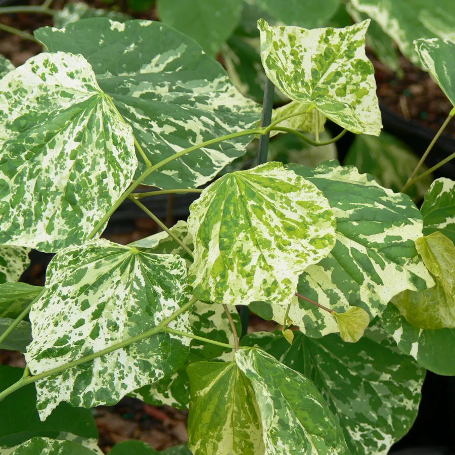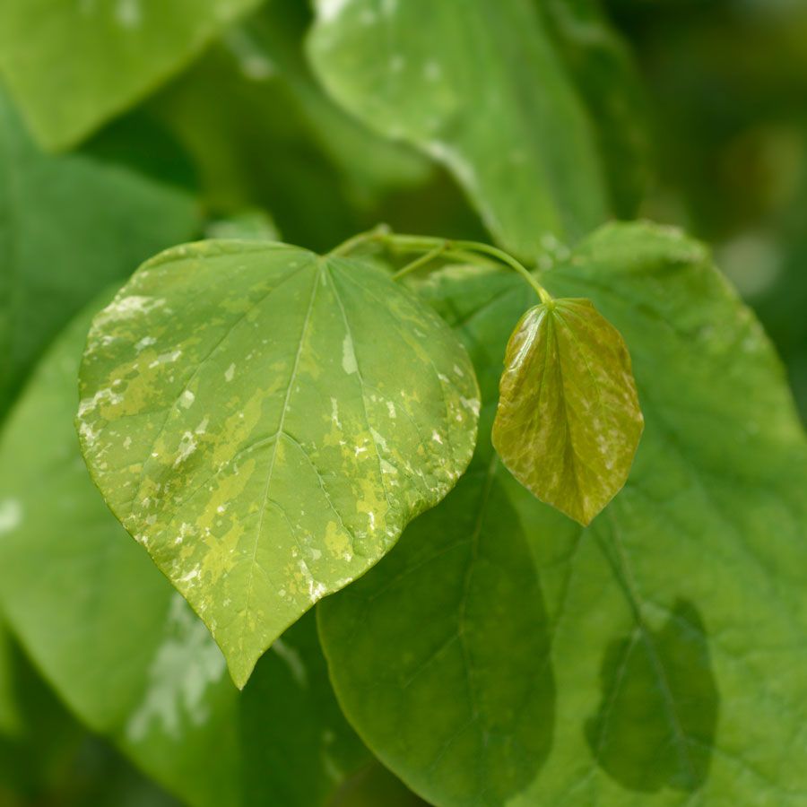 Cercis 'Alley Cat' is a deciduous understory tree celebrated for its beautiful architecture, abundant colorful flowers, and extraordinary variegated foliage. In spring, this tree puts on a spectacular display with clusters of charming pea-like rich-pink flowers adorning its bare branches before the leaves emerge. These nectar- and pollen-rich blooms provide a vital food source for pollinators, including bees and early season butterflies. Following the flowering period, dry, flattened, bean-like seedpods appear in mid to late summer, offering sustenance to several species of songbirds throughout fall and winter. The tree's graceful canopy of large, heart-shaped leaves emerges after the flowers, initially showing copper pink and soft green hues, before developing attractive white splashes and speckles as they mature. The leaves do not revert to green or scorch in the sun, maintaining their stunning appearance all season long.