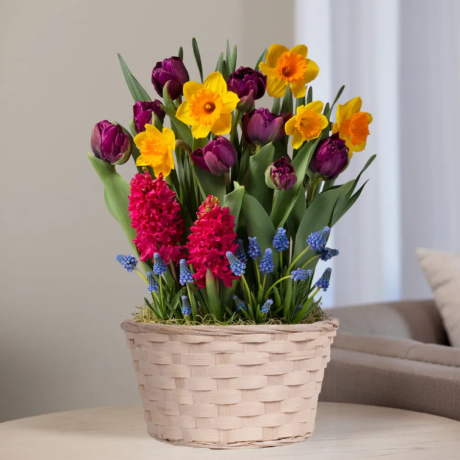 The Cheerful Wishes Bulb Garden includes bright and fragrant seasonal favorites, including deep purple tulips, golden yellow daffodils, bold pink hyacinth, and vibrant muscari, curated in a festive living gift. Sending a lasting, living gift this spring is easy and carefree.