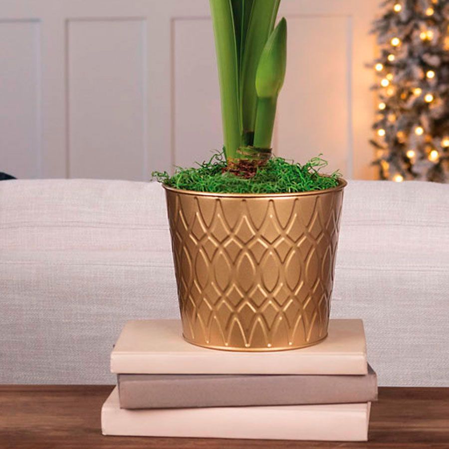 The Classic Holiday Single Red Lion Amaryllis Flower warms cold winter days with its glowing golden tones and festive red blooms. A single Red Lion amaryllis bulb comes nestled in a beautiful gold container embossed with never-ending ellipses. The bulb produces a multitude of large, long-lasting, classic red flowers on its stem. This captivating gift adds a touch of glitz and glamour to the holidays and makes a unique present that will enchant its recipient.