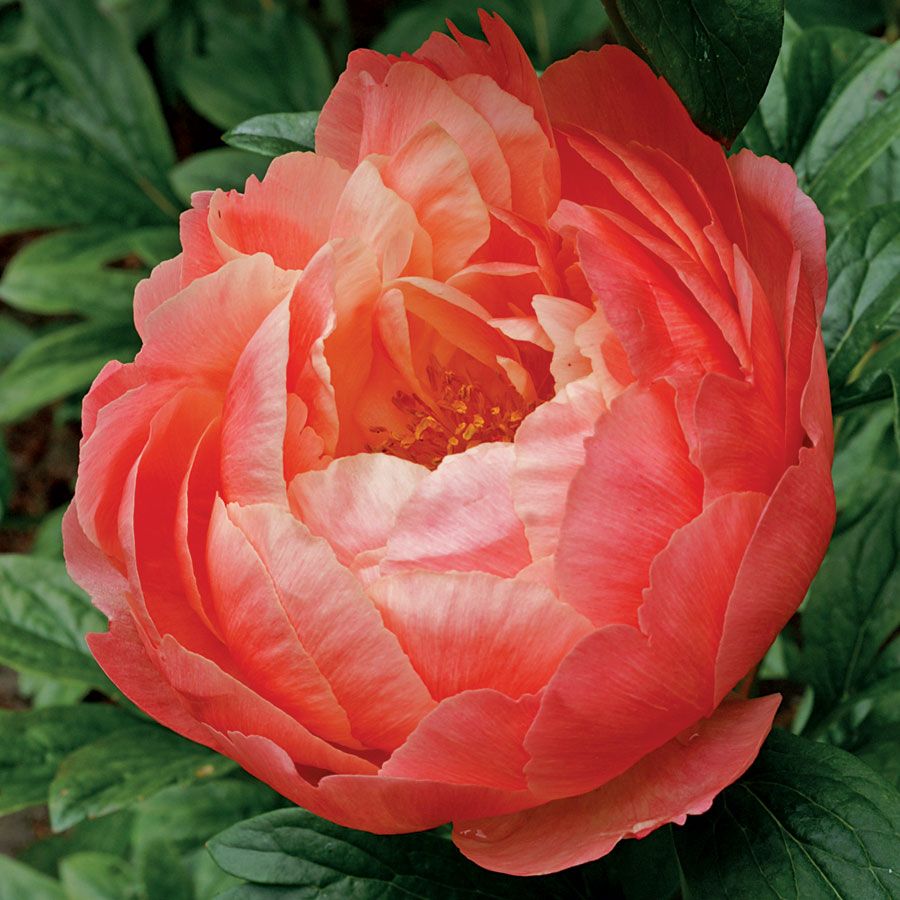 A color breakthrough for peonies. When this 'Coral Charm' Peony was introduced, it won the 1986 Gold Medal of the American Peony Society, and has been winning hearts ever since. The deep coral buds—beautiful in themselves—open to bowl-shaped blooms with gracefully incurved petals of coral-peach surrounding a frilly, glowing mass of stamens. 5 to 6 inches across and very long-lasting fresh or cut, these mid-spring blooms are the focal point of any garden setting.