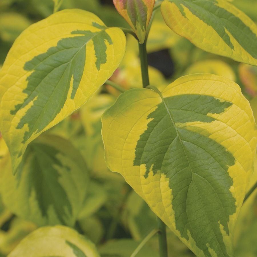 A Proven Winners® ColorChoice® Flowering Trees variety, Cornus Golden Shadows® Pagoda Dogwood is a small native understory tree offering year-round interest, grown for its elegant architecture, distinctive variegated foliage, and attractive flowers. A strong structure of gracefully tiered, horizontal branching gives this plant year-round appeal. Large and brilliantly colored, the heart-shaped, bright yellow leaves have an irregular center splotch of emerald green, with new growth flushing reddish orange in cool weather. Fragrant clusters of lacy white blossoms appear on old wood and attract pollinators. Bluish black fruits (drupes) follow in midsummer, supporting songbirds.