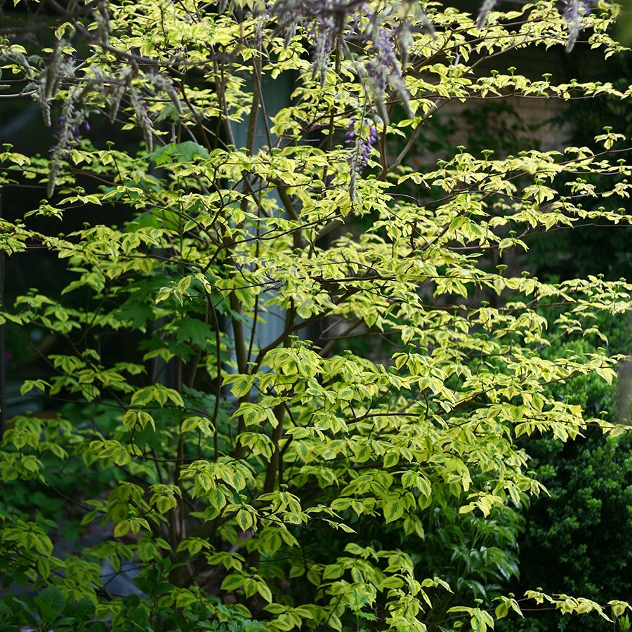 A Cornus alternifolia, syn Swida alternifolia species, commonly called pagoda dogwood or alternate-leaf dogwood, Golden Shadows has an upright, vase-shaped habit and a vigorous growth rate. Pagoda dogwoods make especially lovely specimens but are highly adaptable to many landscape applications and are stunning when grouped or massed.