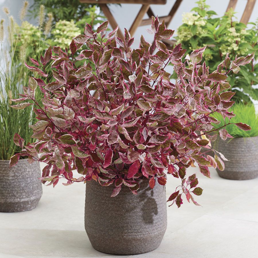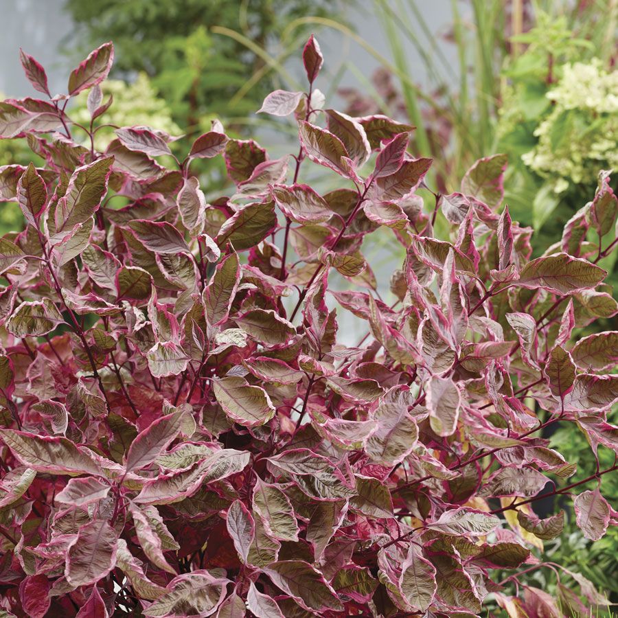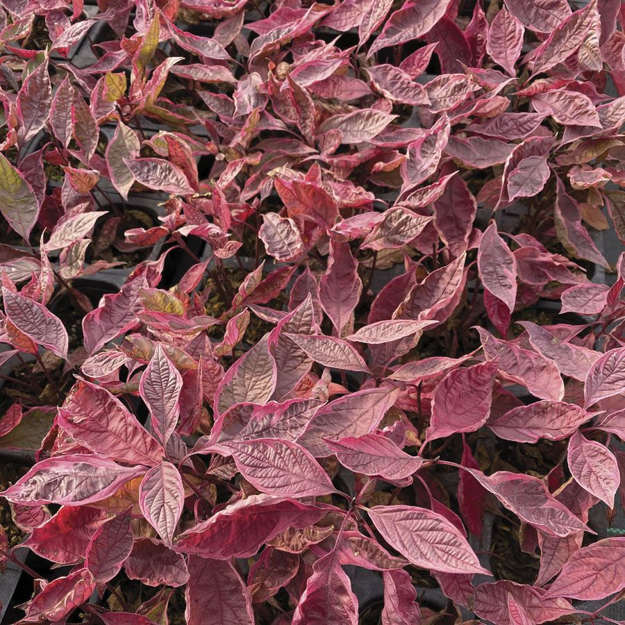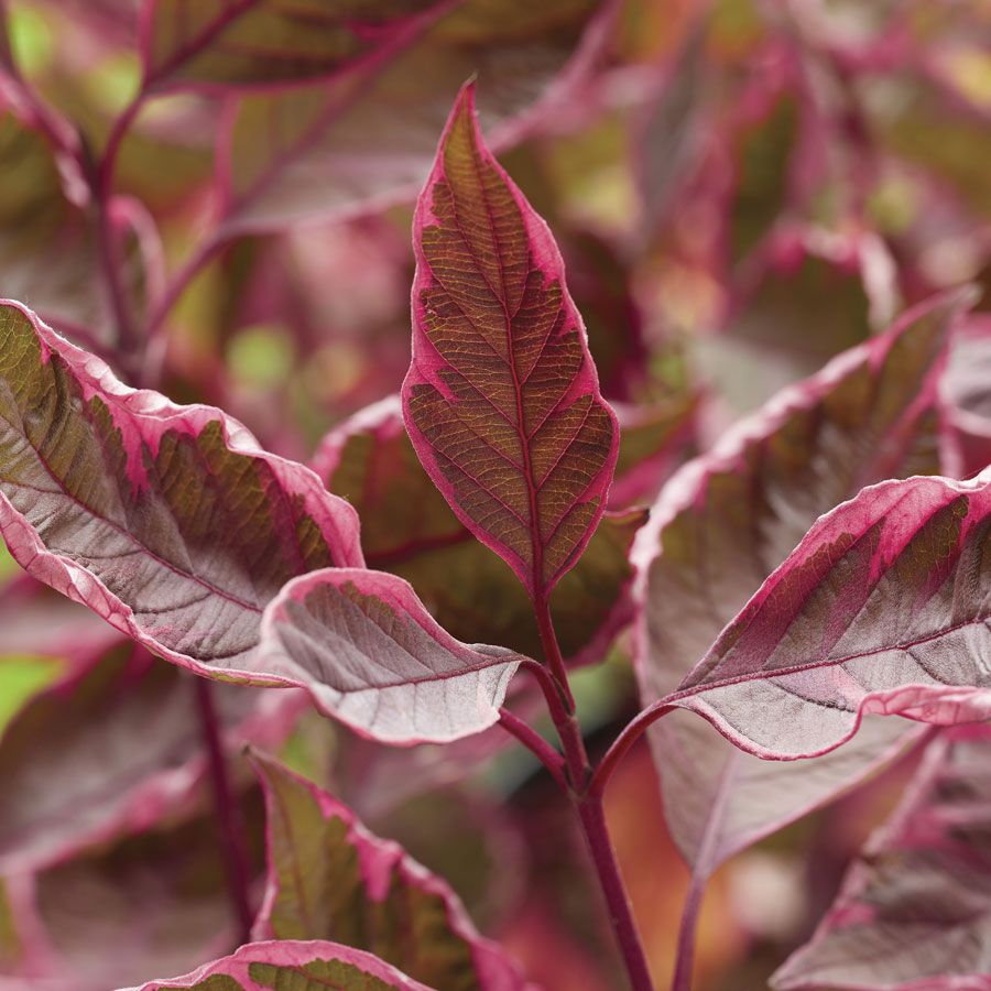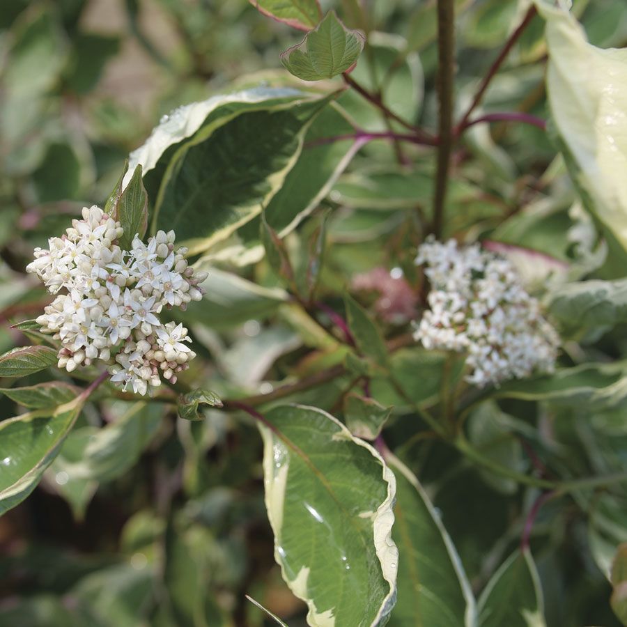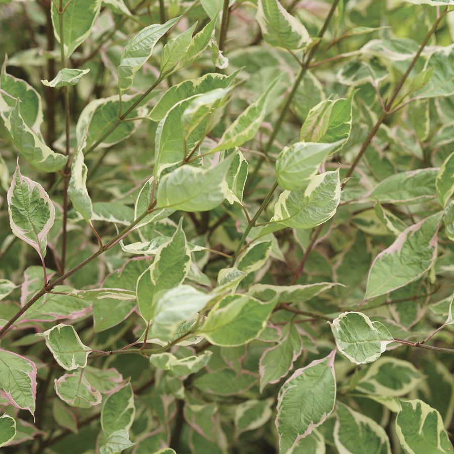 A Proven Winners® ColorChoice® Flowering Shrubs variety, Cornus Sgt. Pepper™ is a multistemmed deciduous shrub grown for its pretty form and ever-changing foliage color. Its green and white variegated leaves emerge with pink tones, which fade with the onset of summer but return at summer's end, as the white leaf margins become bright pink and stems turn deep red in autumn. Flat-topped clusters of small flowers bloom in spring, giving way to white drupes (berries), which ripen midsummer. The flowers are nice additions to floral arrangements, and the drupes are a tasty treat for songbirds.