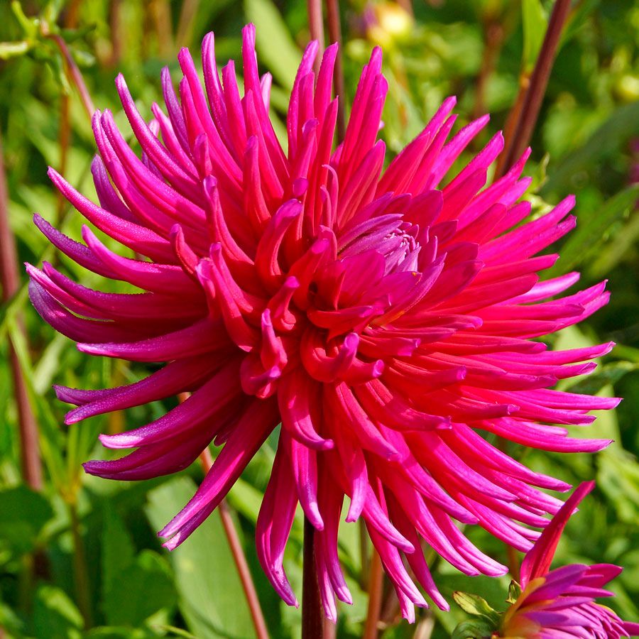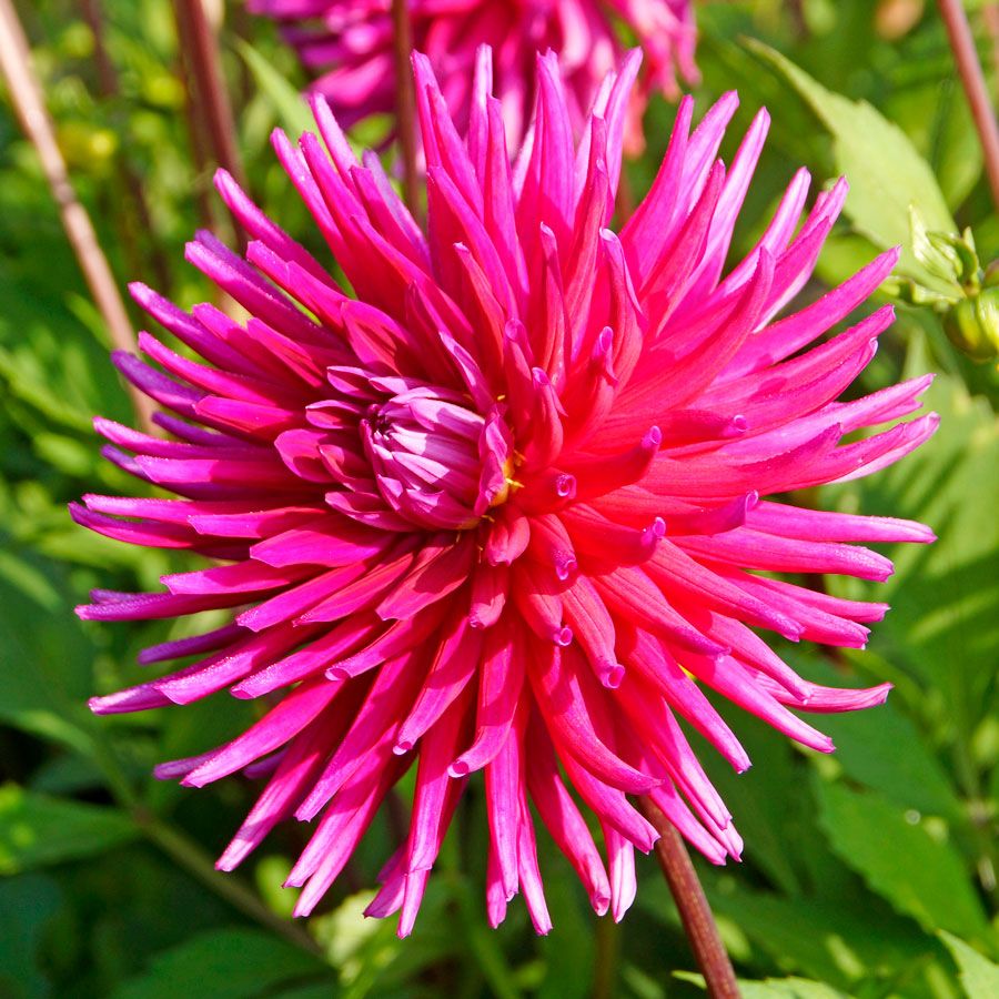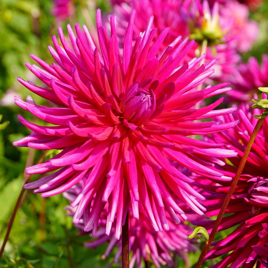 Plant Dahlia 'Purple Gem' early spring, and in midsummer to late fall, typically to first frost, it blooms in masses of 5-inch cactus-shaped fully double flowers with pointed and rolled petals in a shimmery shade of magenta purple. Borne on long, sturdy burgundy stems, the highly decorative blooms attract butterflies and hummingbirds to the garden and make excellent cut flowers.