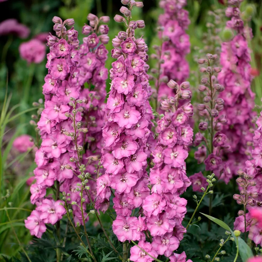A member of the Delphinium Delgenius™ series, the result of over 10 years of breeding, Delgenius™ Chantay offers spring and summer interest. Freely and continuously flowering, the plant sets multiflowered stems that bloom for weeks in huge rose pink double blooms with a white bee. The flamboyant flowers create spectacular displays, attracting bees, butterflies, and hummingbirds to the garden, making excellent floral arrangements.