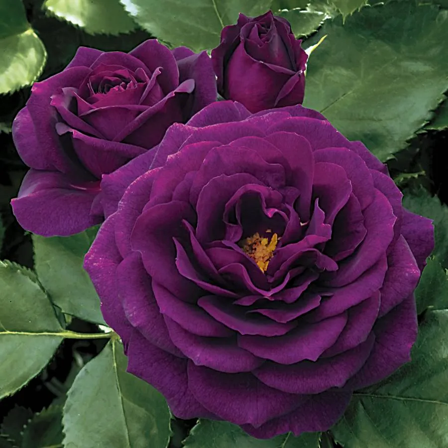 These flowers are fully 4 inches wide, boasting up to 40 gently reflexed petals of deepest purple around a small frilly yellow center, which won't reveal itself until the blooms are fully extended and mature. From the petals emanates a rich, evocative, heady clove-like fragrance that fills garden or home with the essence of the summer rose garden.
