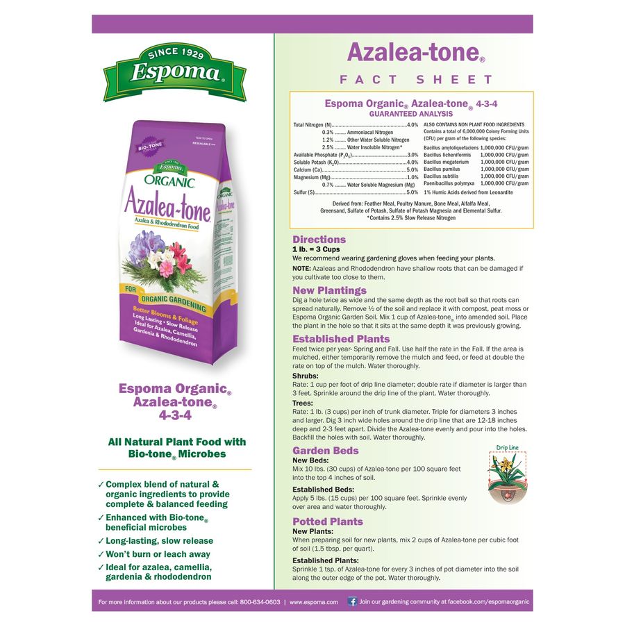 Well suited for azaleas, rhododendrons, camellias, and similar shrubs, Azalea-tone performs reliably in beds, borders, and foundation plantings. Apply in early spring at the first sign of bloom color, then again in late fall at half the spring rate to maintain soil fertility. Distribute evenly around the drip line and water thoroughly to activate nutrients. In mulched areas, remove mulch before application or increase the rate when applying over mulch to ensure proper absorption.