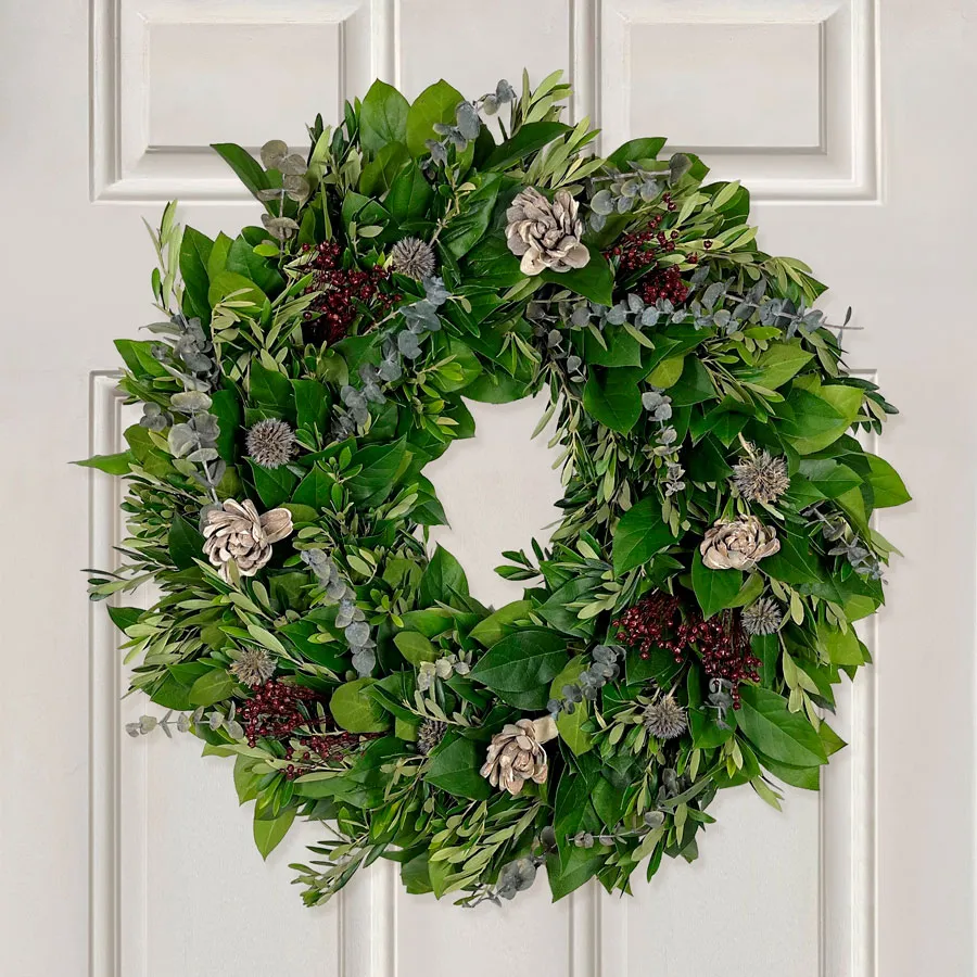 The Eucalyptus Rain Wreath is a celebration of nature's bounty and botanical beauty, handcrafted to bring a touch of refreshing elegance to your home. This eucalyptus wreath is adorned with a rich mix of fresh, fragrant eucalyptus, complemented by natural olive, salal, enchanting echinops, and wild berry flax, creating a lush and inviting display. Perfect for those who cherish the invigorating scent and verdant greenery of eucalyptus, this eucalyptus wreath transforms any space into a serene retreat. The Eucalyptus Rain Wreath blends the distinct textures and colors of its components into a harmonious whole. Whether you're looking to refresh your decor for the season or searching for the perfect gift, the Eucalyptus Rain Wreath, a perfect eucalyptus wreath, adds a sophisticated and natural element to home decor, embodying the spirit of a tranquil rainforest.