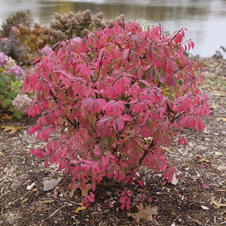 A Proven Winners® ColorChoice® Flowering Shrubs variety, Euonymus Fire Ball Seedless™ is the only seedless, sterile, non-invasive burning bush. A true innovation, this shrub will not spread and become invasive like conventional burning bush, but its green summer leaves still turn the same fiery red color in fall. Although Fire Ball Seedless is grown for its gorgeous color-changing foliage, the shrub does bloom in tiny green flowers in spring.
