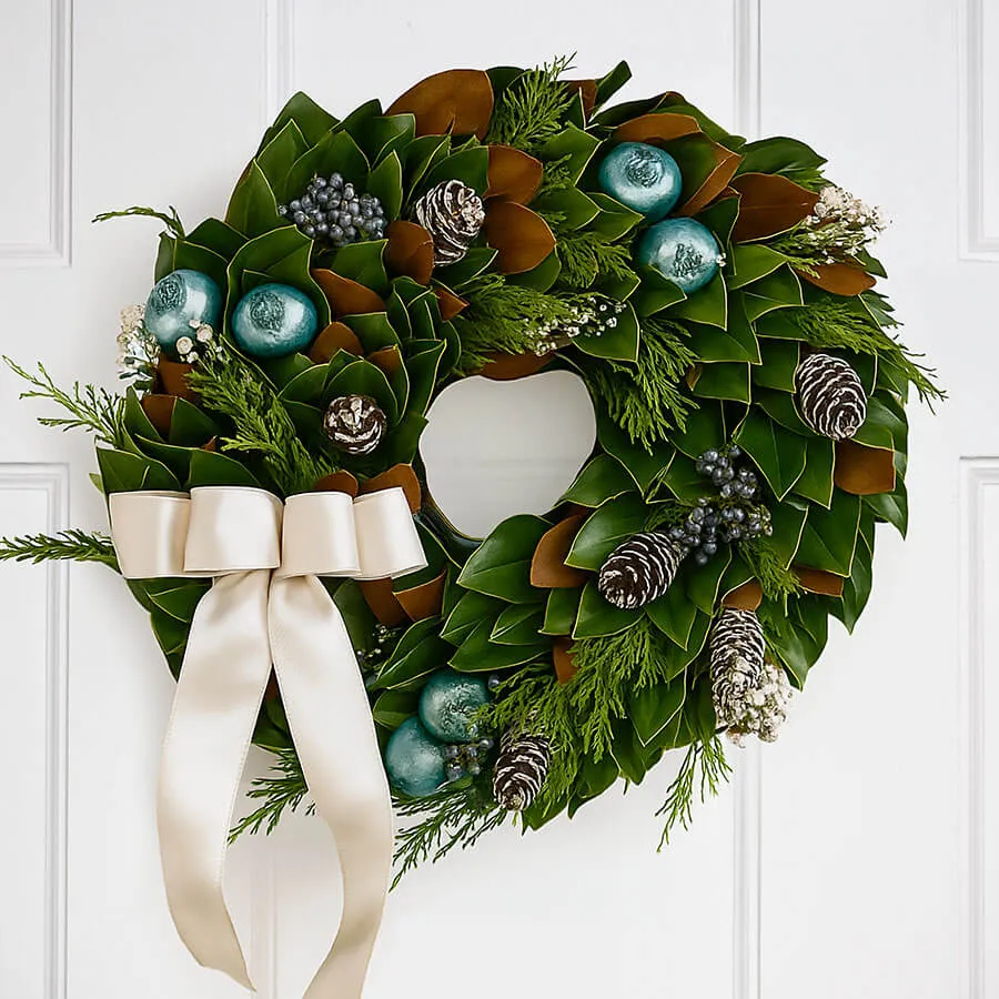 If you're dreaming of soft snow and frosted mornings, welcome winter right to your doorstep with our First Snow Wreath. This 24-inch handcrafted design features frosted natural cones atop lush magnolia leaves, accented with sprigs of golden cedar, yarrow, pomegranates, and blue berries for unexpected touches of seasonal color. A charming blend of natural beauty and festive detail, it's the perfect gift for friends or family, and a delightful way to dress your own home for the holidays.