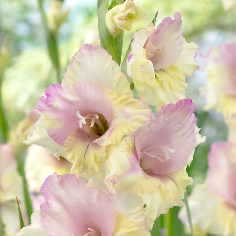 'Mon Amour' is a large-flowering gladiolus that grows between 36 and 60 inches tall, bringing an architectural elegance to any garden. Blooming in midsummer, this variety produces dense spikes of ruffled bicolor flowers in soft pastel shades of lavender and yellow. The silky petals create a striking display as they open from the bottom to the top of the scape. Borne on strong, slender stems, the long-lasting blooms are perfect for stunning monofloral bouquets or as showstoppers in the garden.