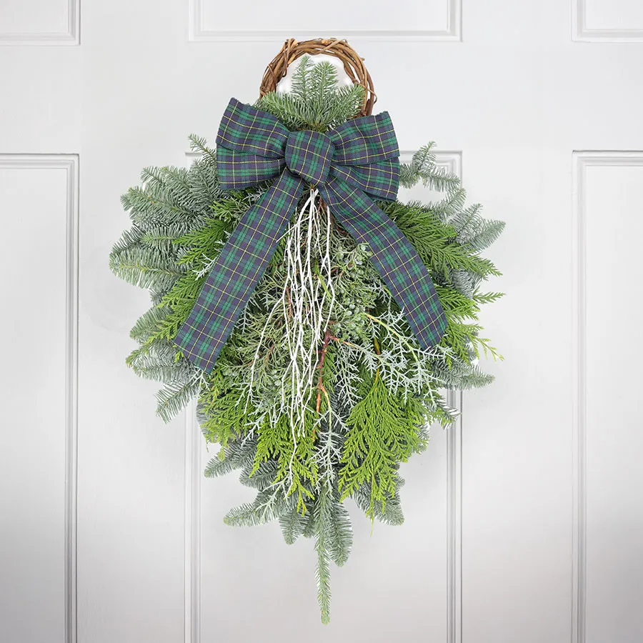 This refreshing twist on traditional greenery brings a frosty elegance to your holiday décor. The Have a Blue Christmas Swag features noble fir, Western red cedar, Oregon blue-berried juniper, Carolina sapphire, and white-tipped accents, all finished with a rich blue bow. Measuring approximately 16 inches wide by 28 inches tall, it's perfect for doors, columns, or modern winter themes. The included grapevine hanger makes it easy to display wherever you want a pop of seasonal serenity.