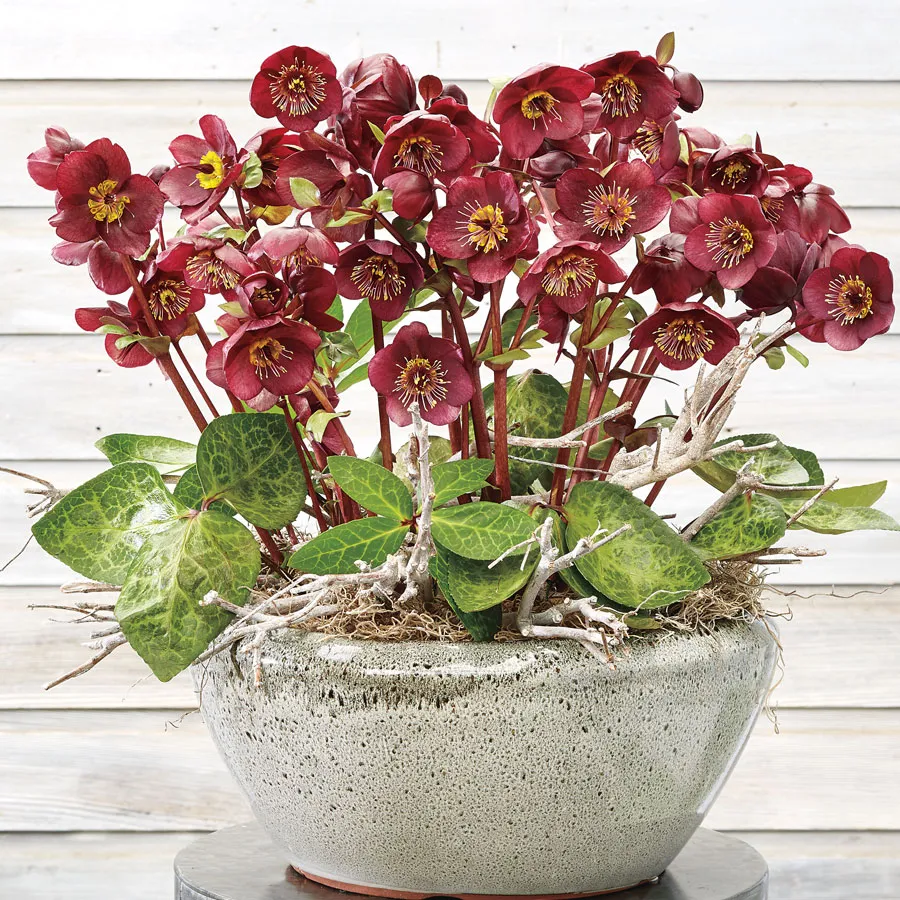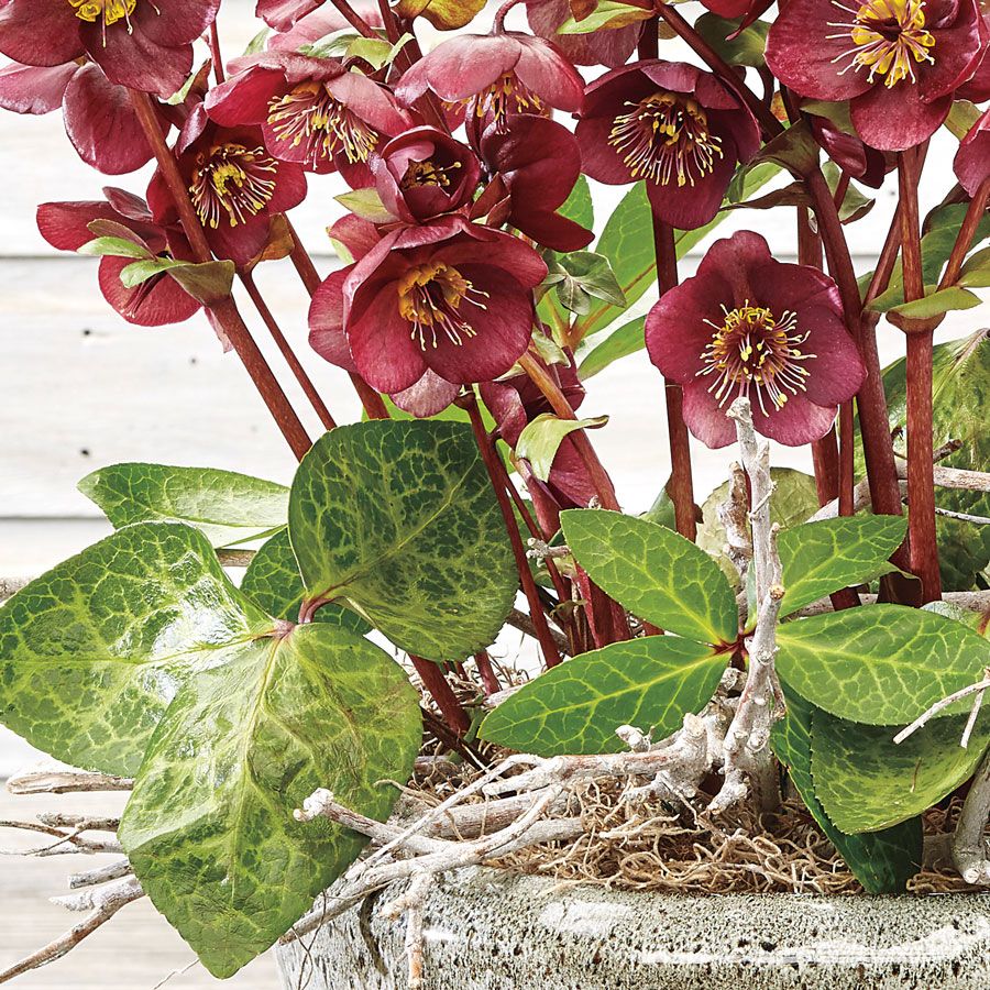 Vibey Velvet™, part of the Frostkiss® series, is an evergreen perennial that adds texture and rich color to the garden throughout the year. Reaching 12 to 18 inches in height and spread, Vibey Velvet blooms heavily in winter, producing a saturated display of dark red, burgundy-flecked flowers. These slightly smaller flowers are held singly on sturdy, deep-red stems that rise above a dense rosette of leathery, variegated foliage. Long-lasting and nectar-rich, Vibey Velvet's blooms add beauty to the winter landscape and serve as a vital food source for early-emerging bees. The flowers make an excellent addition to winter bouquets, bringing vibrant color indoors at a time when most flowers are dormant.