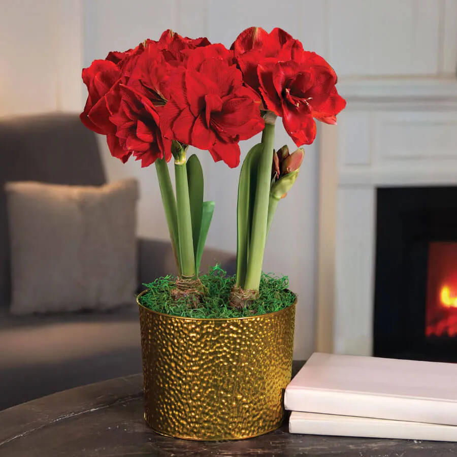 Two bulbs, endless excitement. This double Ragtime Amaryllis bursts into a bold display of rich red blooms, each one fully double and packed with saturated petals. The result is lush, layered, and celebratoryperfect for a space that loves a little holiday drama. Set in a textured metal container with a luxe gold finish, this amaryllis gift adds sparkle to the table and joy to the season. Share it with a holiday host, your boss, or anyone who makes a big impression year after year.