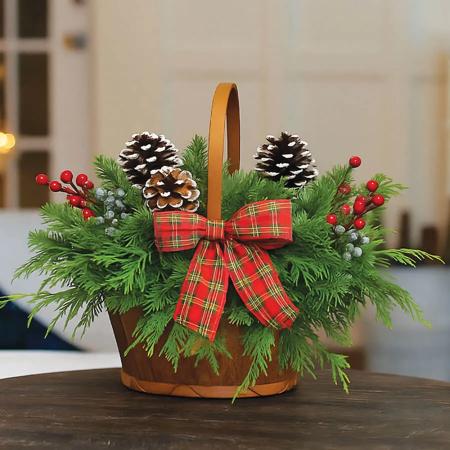 Crafted with noble fir, Western red cedar, and blue-berried juniper, this centerpiece brings timeless cheer to any holiday table. Faux red berries, white-tipped pinecones, and a traditional plaid bow complete the look. It's perfectly sized for cozy dining tables, coffee tables, or buffets, and makes a lovely host or neighbor gift too. Approximately 14 inches long by 10 inches tall. Fragrant, festive, and ready to display right from the box.
