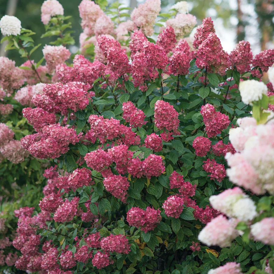 Easy-to-grow hydrangea with flower heads in shades of white, pink, and red