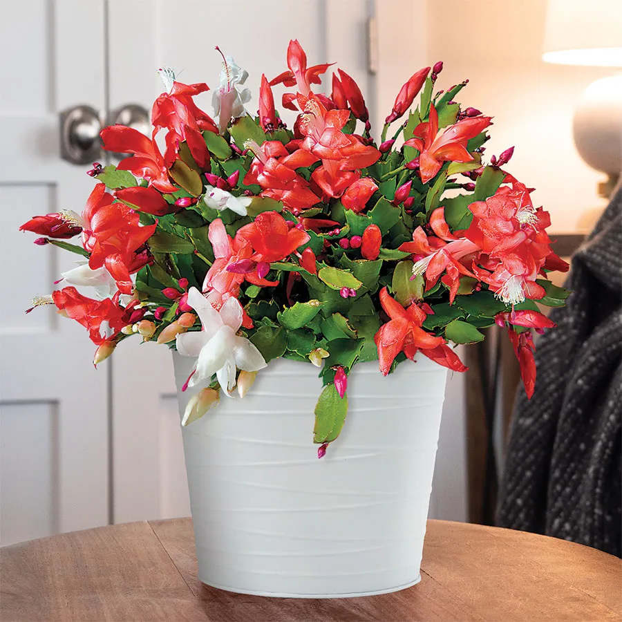 When you want to deliver a ray of sunshine and a smile, send the Joyous Christmas Cactus. Planted in a beautiful white container with a simple embossed pattern, this 6-inch zygocactus creates a festive, show stopping display on a holiday table with its bright and plentiful blooms, which are especially appreciated in winter. The Christmas cactus makes an ideal holiday gift. And your friends and family can enjoy this long-lasting living gift season after season.