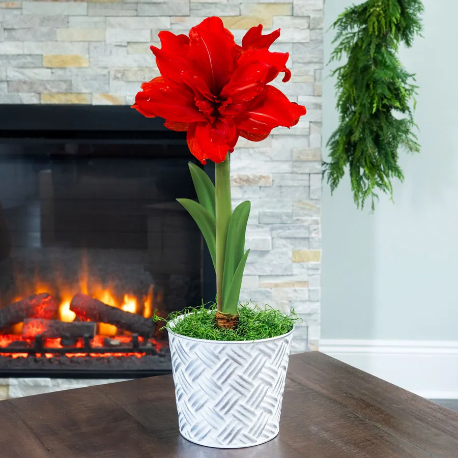 The Joyous Season Single Red Peacock Amaryllis Flower is a classic beauty with a traditional silver, red, and white holiday color combo. But yes, it's a bit of a show-off that simply exudes chic elegance. The Red Peacock amaryllis bulb comes nestled in a frosted silver and white container with a woven texture, a modern take on a classic basket. The bulb blooms in flamboyant deep-red flowers that flaunt double petals with a thin white center line. This amaryllis gift has a universal appeal that fits any decor and makes an impressive present that is sure to delight its recipient.