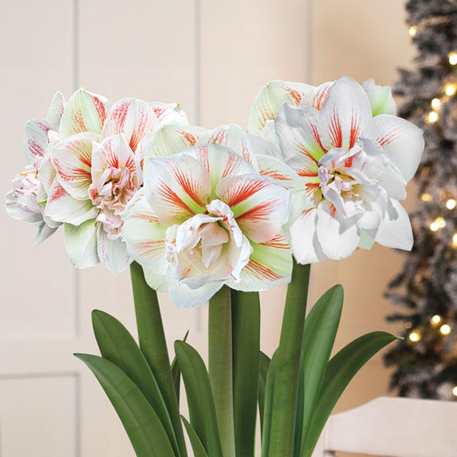 The Lavish Winter Triple Double Nymph Amaryllis Flower will add a luxurious touch to holiday celebrations. Nestled in a gold-frosted container with a diamond hobnail texture, 3 Double Nymph amaryllis bulbs bloom in opulent 7- to 9-inch flowers. Each bloom features bright white petals adorned with striking coral to red veins and striations, creating a dazzling display. Perfect for gifting or for use as a centerpiece, this unique amaryllis brings a touch of elegant beauty to any setting.