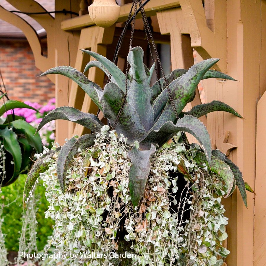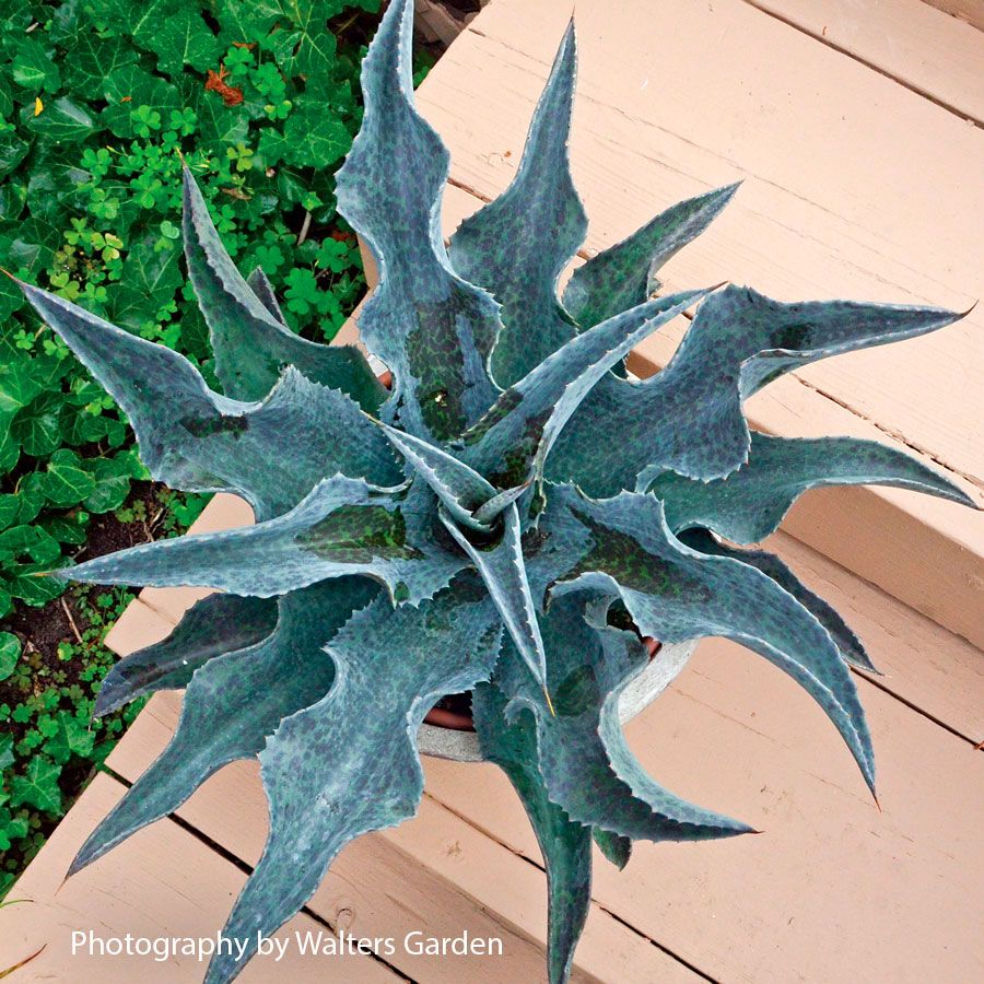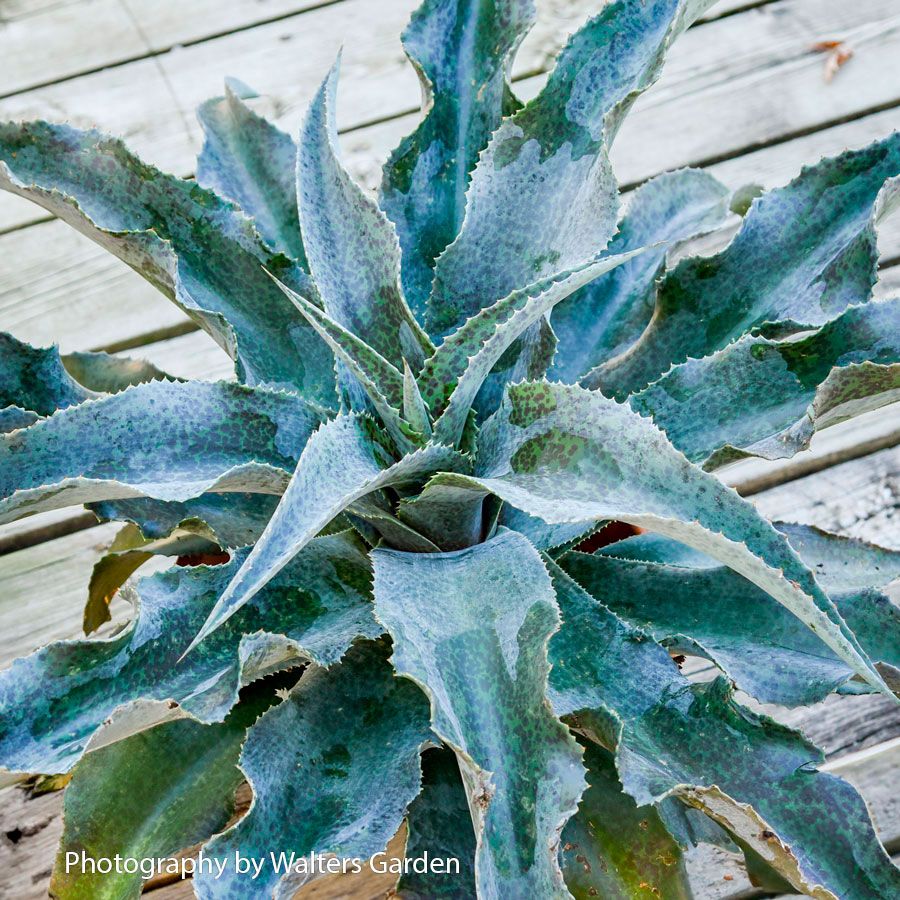 Mangave Art & Sol® 'Catch a Wave' is an exceptional succulent that brings unique texture and striking beauty to gardens and containers. This compact plant, part of the Proven Winners® Art & Sol® collection, grows 8 to 10 inches tall and spreads up to 18 to 20 inches wide, forming a sculptural rosette of undulating leaves. Its thick, silvery-blue foliage develops rich dark spots in full sun, giving the plant an artistic, almost whimsical appearance. The leaf edges curl slightly upward, showing off soft, flexible teeth along the margins. With its wave-like leaf structure, 'Catch a Wave' looks like a piece of living art, adding a unique architectural interest and color to garden beds, rock gardens, and container arrangements.