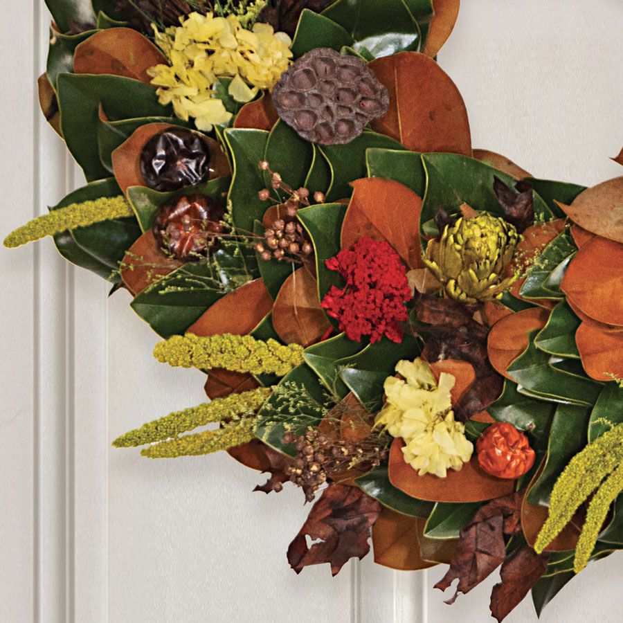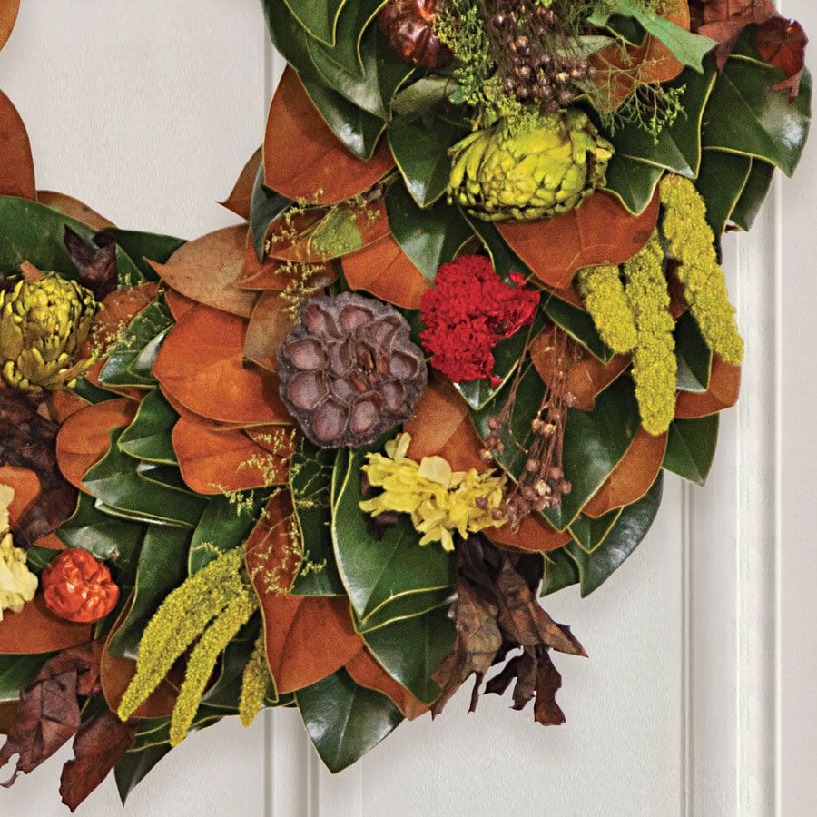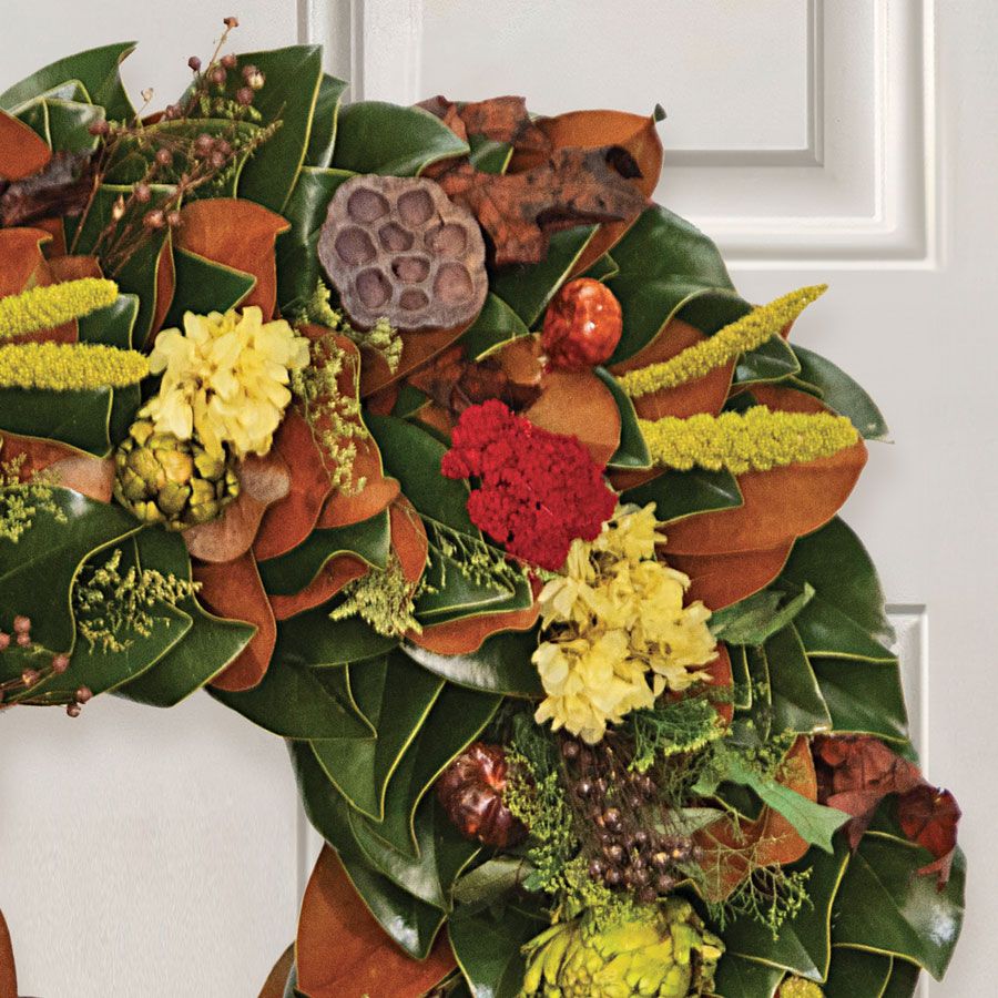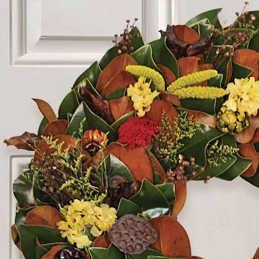 The Merlot Valley Wreath introduces the rich hues of the fall season to your home. This fall wreath combines fresh magnolia with dried autumn leaves, creating a vibrant tapestry of fall colors at your doorway. Bright pops of natural yellow from artichokes, setaria, and hydrangeas stand out beautifully against the lush greenery. Complement this fall wreath with the coordinated Merlot Valley Centerpiece for a harmonious autumnal display throughout your home. Whether adorning your front door or used as a decorative accent indoors, this fall wreath is a testament to the season's beauty, and it makes the perfect holiday gift.