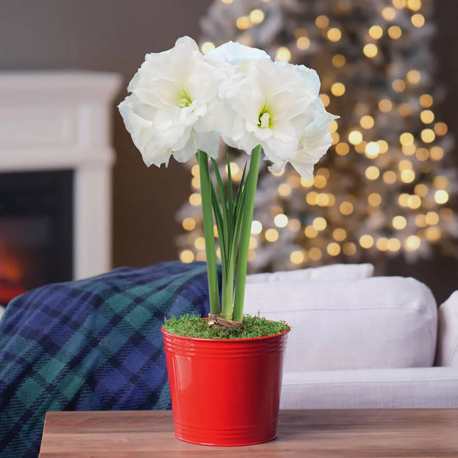 Send the holly jolly feel of Christmas with the Alfresco Amaryllis, showcasing pure white double blooms, nestled in a classic bright red container. Evokes the look of Santa's hat, white on top and red on the bottom. This living gift offers a cheerful and festive lookideal for those who appreciate the classic symbols and colors of the season.
