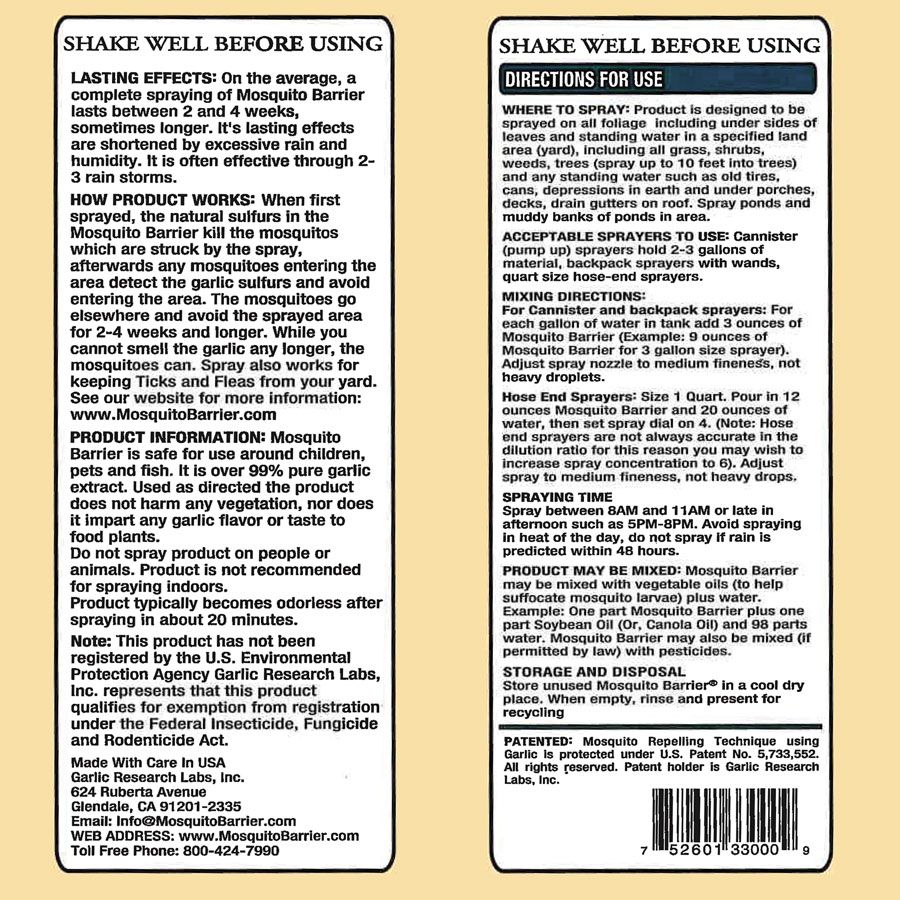 To use, dilute Mosquito Barrier at a 100:1 ratio. One quart covers up to 1.25 acres (54,450 square feet). Apply three to four times during the mosquito season, or as needed.