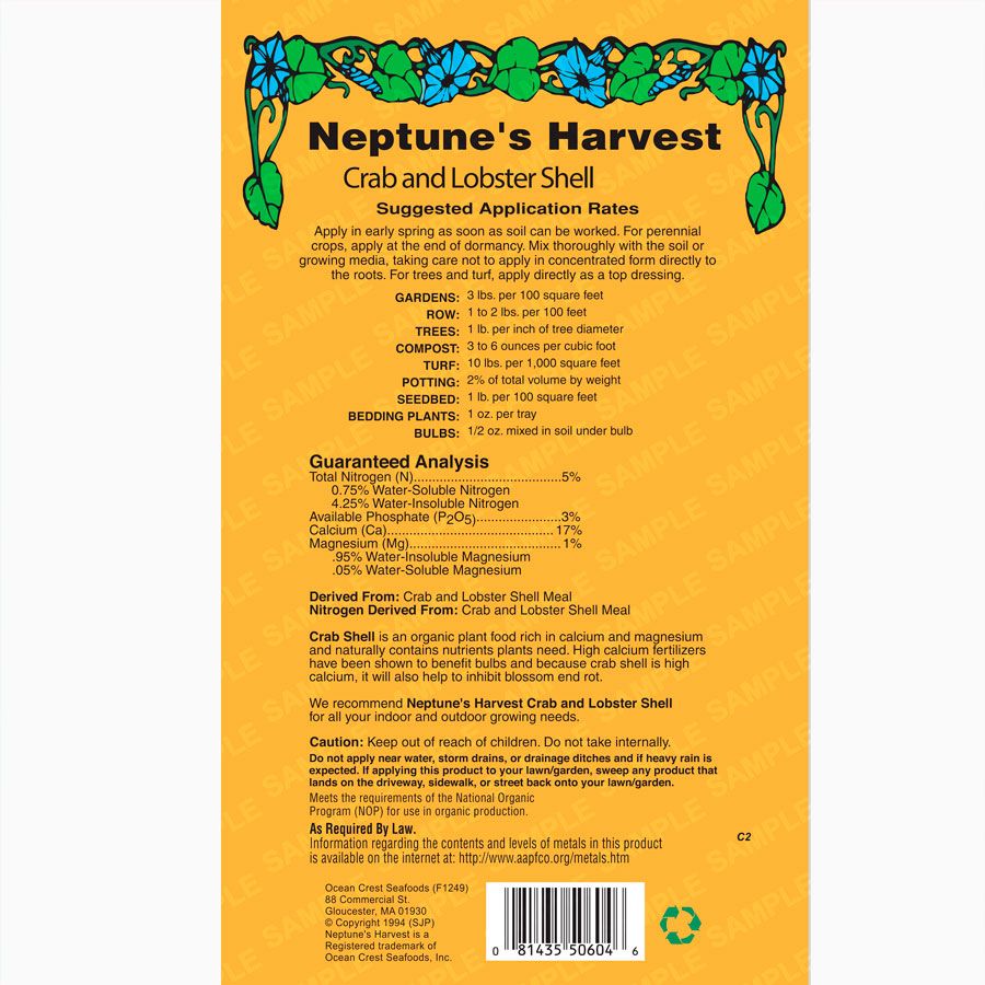 Neptune's Harvest Organic Crab & Lobster Shell is a natural, nutrient-rich plant food packed with essential calcium (17%) and magnesium (1%) to support strong, healthy growth. This 5-3-0 slow-release formula enhances your overall fertilization program, benefiting flowers, vegetables, lawns, and turf. As it breaks down, it continuously feeds the soil, improving plant resilience and vitality.