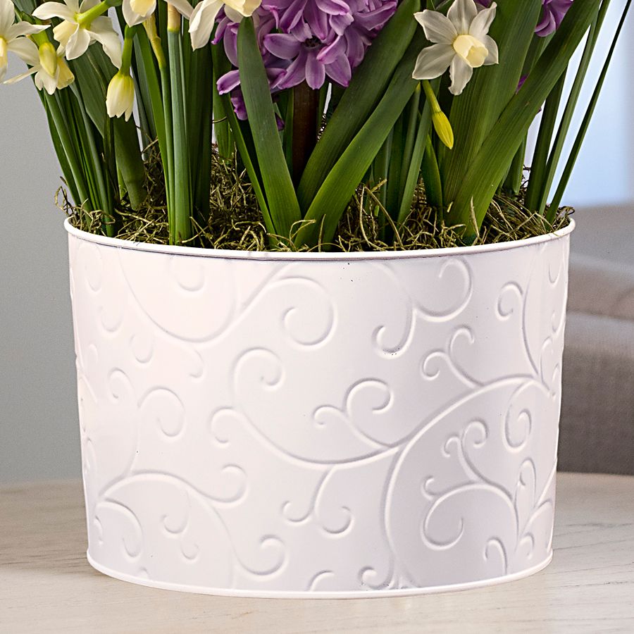 A bright and cheerful gift - the Peach Charm Bulb Garden delivers a lasting and fragrant floral spectacle. Lavender and peach tulips are mixed with creamy white daffodils that boast a peach center cup and complimented by delicate white narcissus and fragrant lavender hyacinth. An exclusive collection of nature's beauty arrives in the container of your choice and elevates your gift giving experience this season.