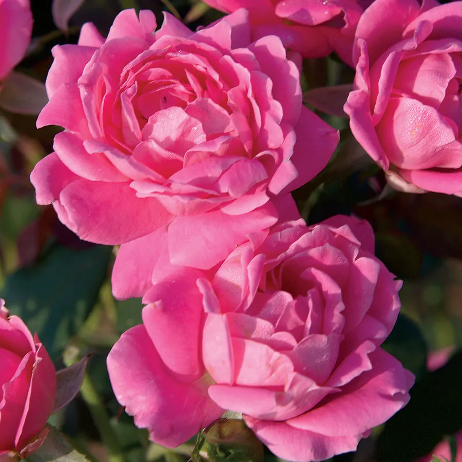 This dependable and free flowering shrub has a dense, bushy habit that quickly reaches 3 to 4 feet high and wide. It greets early spring with abundant small clusters of 3-inch, bright bubblegum pink double blooms with 18 to 24 petals and a light tea rose fragrance, banked by small light green foliage. The shrub blooms continuously right up to the first frost and are.