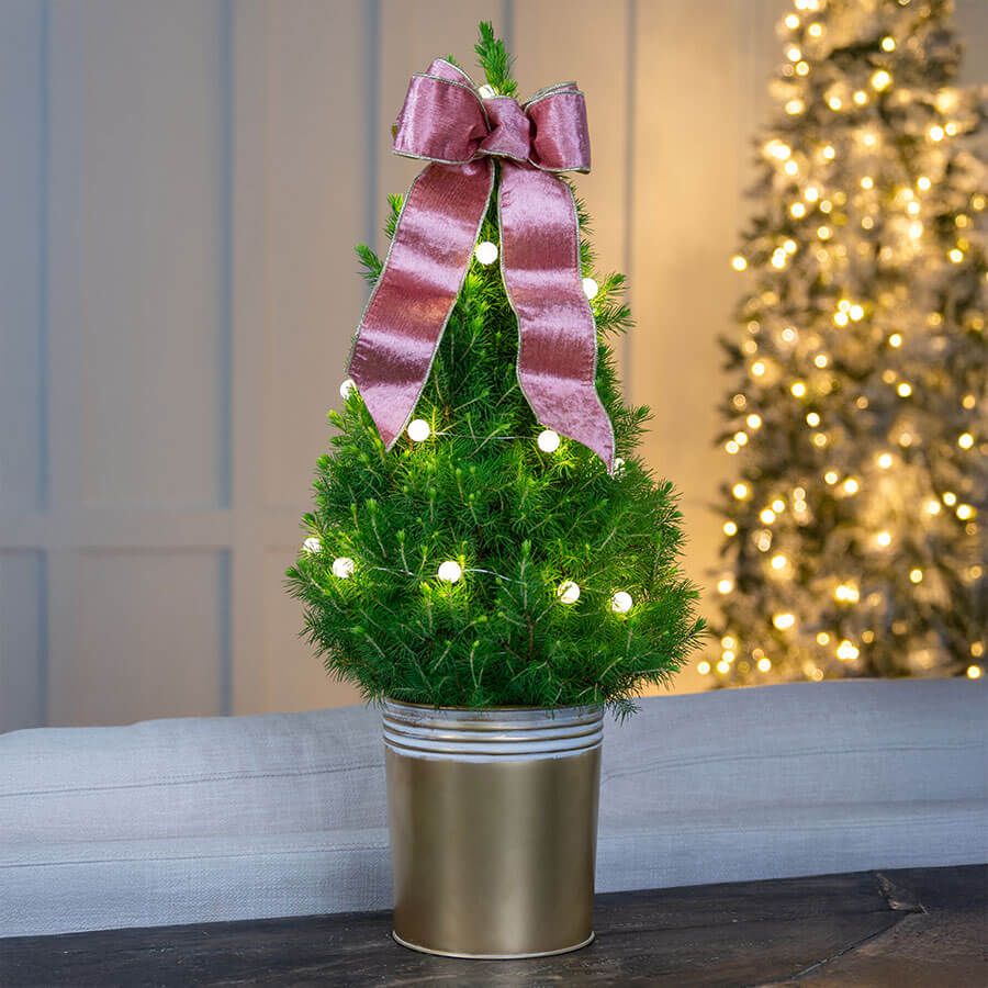 Brighten the season with a living gift that blends timeless charm with a touch of holiday glamour. The Pink Shimmer Decorated Tabletop Tree offers an elegant twist on tradition, featuring a live Alberta spruce nestled in a glossy gold container. Standing 18 to 24 inches tall, this tree is topped with a hand-tied double bow crafted from wide pink velvet ribbon backed in gold lamé-like fabric-an unexpected and luxe finishing touch. Mini frosted globe-shaped lights add a soft, twinkling glow, perfect for creating a festive moment on tabletops, holiday mantels, or even dressers. With its rich textures and graceful palette, this tree makes a stunning and meaningful gift. Order now and make holiday gifting effortless.