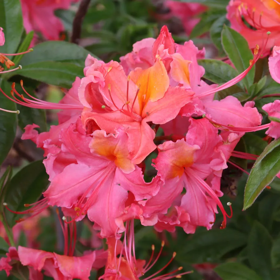 Rhododendron Sweet Reward™ Coral Azalea, part of the Proven Winners® ColorChoice® Flowering Shrubs line, is a deciduous native shrub that reaches 3 to 6 feet in both height and width at maturity. This striking addition to the spring garden dazzles with large, rounded clusters of salmon-hued flowers adorned with bright orange splashes. The blooms are not only visually captivating but also richly fragrant, inviting bees, butterflies, and hummingbirds to the landscape for a lively, pollinator-friendly display.
