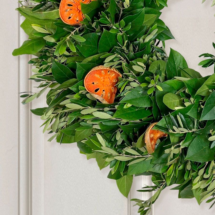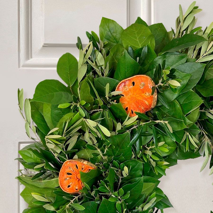 The Simply Citrus Dried Orange Wreath illuminates any space with its vibrant blend of nature's bounty, creating a visual and aromatic treasure that evokes the refreshing essence of a bright new day. This dried orange wreath beautifully combines natural olive and lush salal leaves with perfectly placed slices of citrus, offering a burst of freshness and color that captivates the senses. Ideal for those who appreciate the beauty of nature and the invigorating scent of citrus, the Simply Citrus Dried Orange Wreath brings the zest of a sun-drenched orchard into your home. Whether displayed on your front door or as a centerpiece in your living space, this dried orange wreath adds a touch of warmth and vitality, making every moment feel like a serene morning in a citrus grove. The Simply Citrus Dried Orange Wreath is more than just a decorative item: it's a celebration of the simple pleasures that nature provides, expertly crafted to bring joy and brightness into your or your gift recipient's surroundings.
