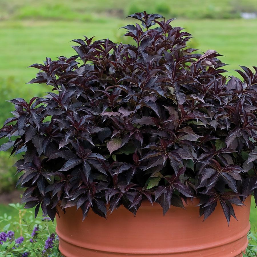 Spilled Wine keeps its purple leaves from spring through fall, not "going green" in summer heat like some others do. In fact, strong sunlight intensifies the dark purple hues, so that by mid-August the foliage nearly looks black. Wow!
