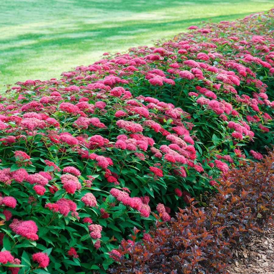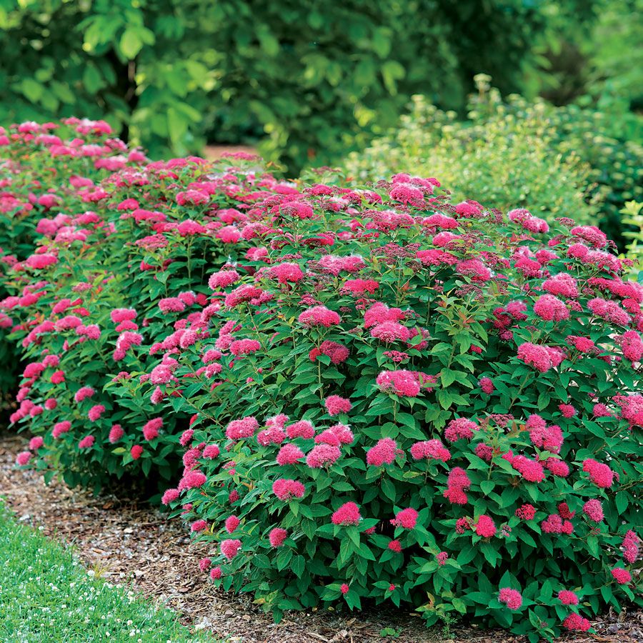 A Proven Winners® variety, Spiraea Double Play Doozie® is a deciduous perennial shrub offering three seasons of interest, blooming spring through fall, typically until the first frost. Truly unique and highly popular, Double Play Doozie® is the first-ever reblooming spirea, blooming on old and new wood. Borne in cone-shaped clusters, the deep red flowers are larger than other spirea. They have a slight, sweet fragrance and attract butterflies and hummingbirds to the garden.