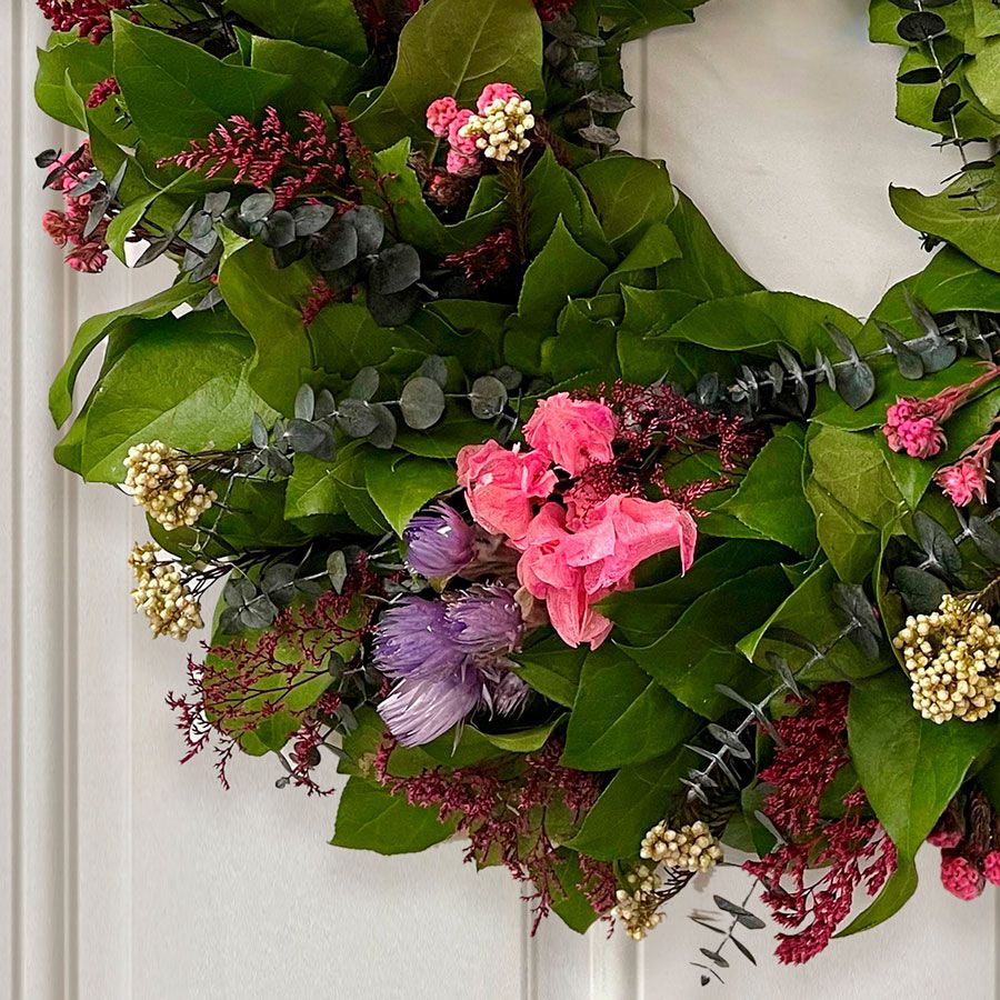 Sunset Bliss Dried Floral Wreath is a celebration of nature's enduring beauty, crafted to bring the essence of a perennial garden into your home throughout the year. This dried flower wreath features a base of lush green salal leaves, elegantly adorned with fragrant dried eucalyptus, brightly colored caspia, and a selection of vibrant dried flowers, creating a display that captures the heart of any season. Designed for versatility and lasting charm, this dried flower wreath seamlessly blends into any decor, offering a timeless appeal that enriches your space with the splendor of the garden. Perfect for any setting seeking a touch of nature's beauty, Sunset Bliss, a dried flower wreath, promises to be a focal point in your home, bringing a sense of bliss with its colorful and aromatic composition. Whether you're looking to refresh your decor for the season or searching for the perfect gift, the Sunset Bliss dried flower wreath is a testament to skilled craftsmanship and the beauty of the natural world.