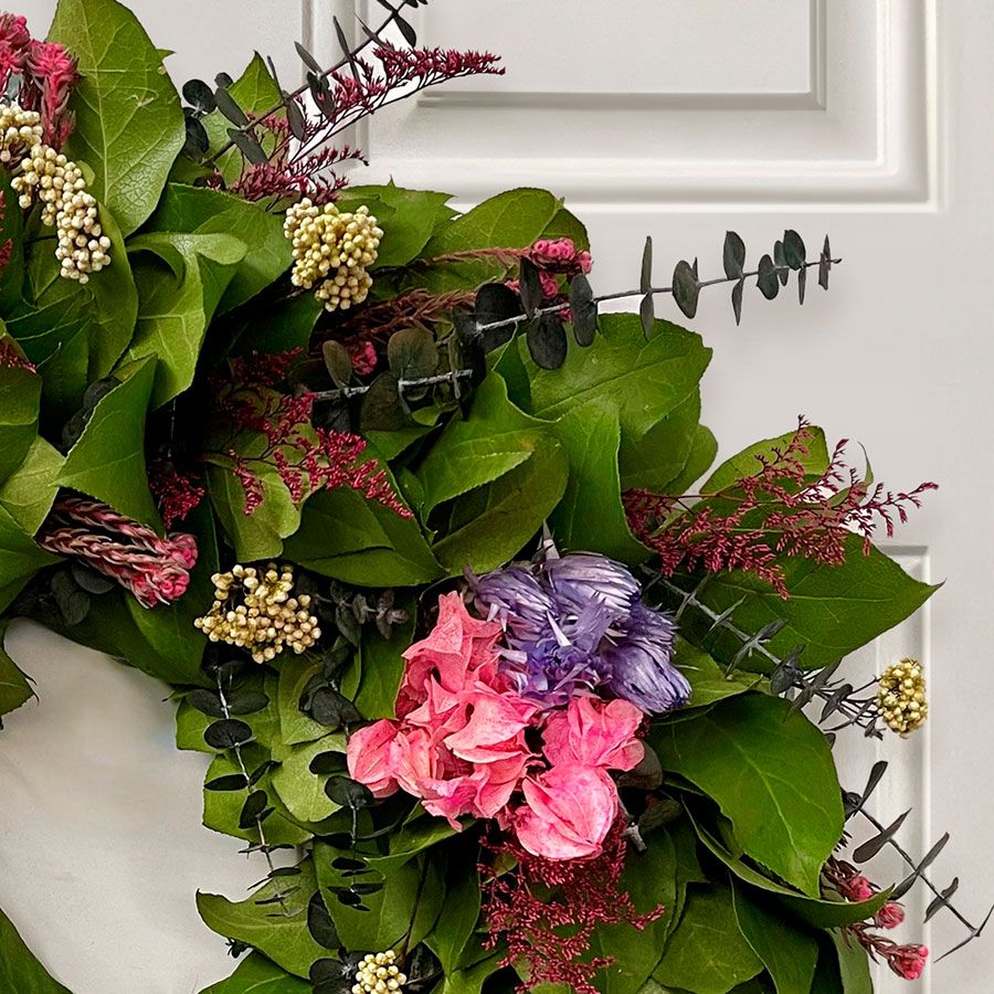 Fresh wreaths, centerpieces, and bouquets will hold their shape and style as they dry. You may prefer to rotate a hanging wreath to prevent a flat side. Preserved elements hold their color longer, while fresh greens and botanicals will gradually fade to lighter tones as they dry.