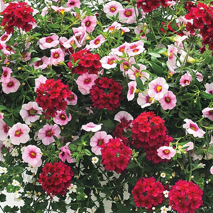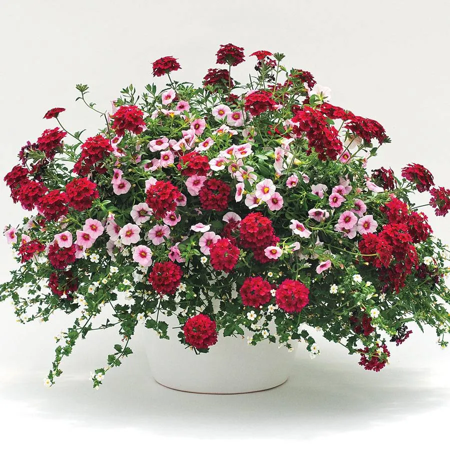 A festive mix of light and dark, large and small, upright and trailing! Velvety deep red Verbena Lascar™ Compact Burgundy offers a mini bouquet on every flowering stem, while tireless Calibrachoa MiniFamous® Light Pink dots the display with bright light from early summer until frost. The long, lush stems of Bacopa Big White Falls,™ studded with tiny blooms, backlight the entire combination. Long-lasting color for any sunny spot, even in punishing August temperatures!