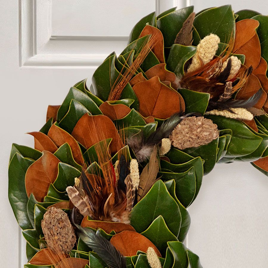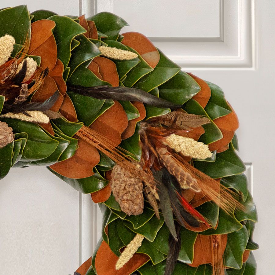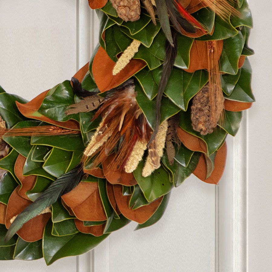 Embrace the spirit of Thanksgiving with the Turkey Pheasant Wreath. This exquisite Thanksgiving wreath is a modern interpretation of the traditional cornucopia, featuring lush, freshly harvested magnolia leaves beautifully accented with natural magnolia pods and delicate sprigs of millet. As a perfect embodiment of the season, this Thanksgiving wreath adds a touch of autumn elegance to any setting. Whether displayed on your front door or used as a striking centerpiece, this thanksgiving wreath transforms your space into a festive and welcoming gathering place for family and friends. Its unique design and natural elements make it a captivating addition to your holiday decor, celebrating the bounty and beauty of the season.