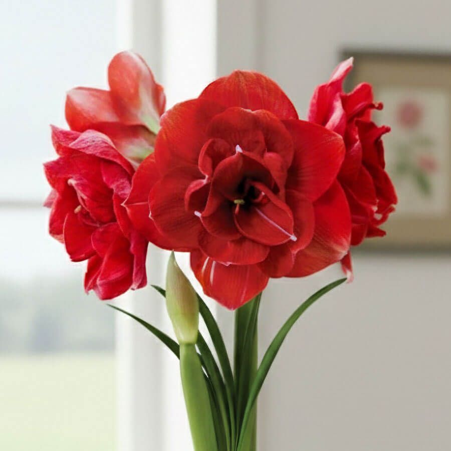 Reaching approximately 18 to 24 inches tall, this potted amaryllis blooms indoors over 6 to 2 weeks, producing massive flowers that can measure up to 7 inches across. Thick, sturdy stems support the weight of the ruffled blooms, allowing them to open gradually and deliver weeks of vibrant color and texture.
