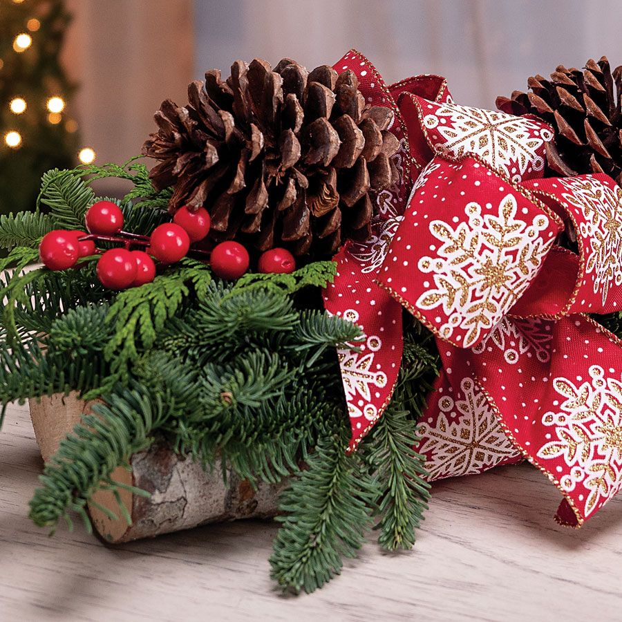 Perfect for the rustic-meets-modern tablescape, the Winter Birch Christmas Centerpiece is a natural beauty with a nostalgic charm reminiscent of the yuletides of yesteryear. Two northwest alder yule logs are minimally embellished with ponderosa pine cones, naturalistic berry branches, and fragrant sprigs of noble fir and western red cedar. A red & white snowflake ribbon tied into a big, bubbly bow bundles all the elements into a lovely holiday display with a decidedly farmhouse feel and country-chic appeal. With its understated elegance, this tabletop centerpiece fits any decor and makes a great gift for anyone on your list.