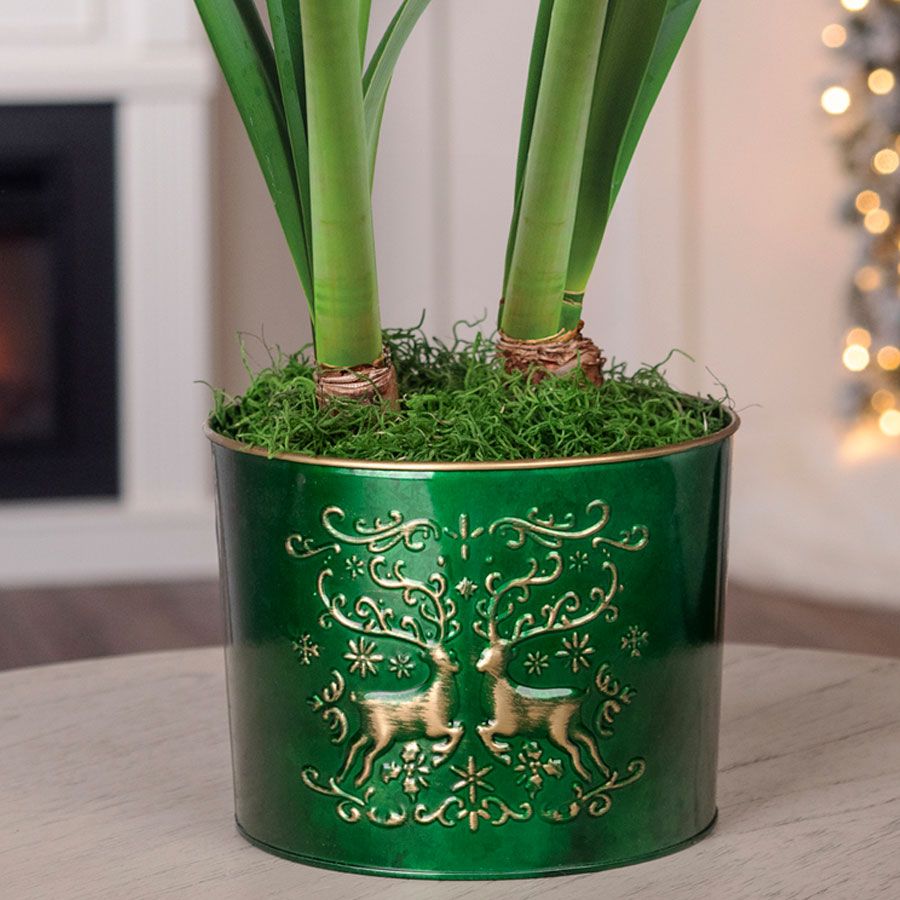 Winter Delight Double Moon Scene Amaryllis Flower creates an elegant holiday display. The 2 Moon Scene amaryllis bulbs arrive nested in a stylish green container embossed with an elaborate golden reindeer design and soon bloom in gorgeous red-striped creamy white blooms on tall stems. This glamorous gift elevates any space and makes a particularly lovely present.