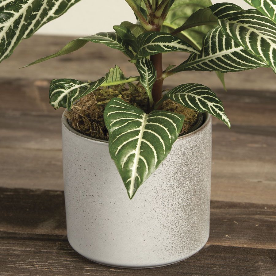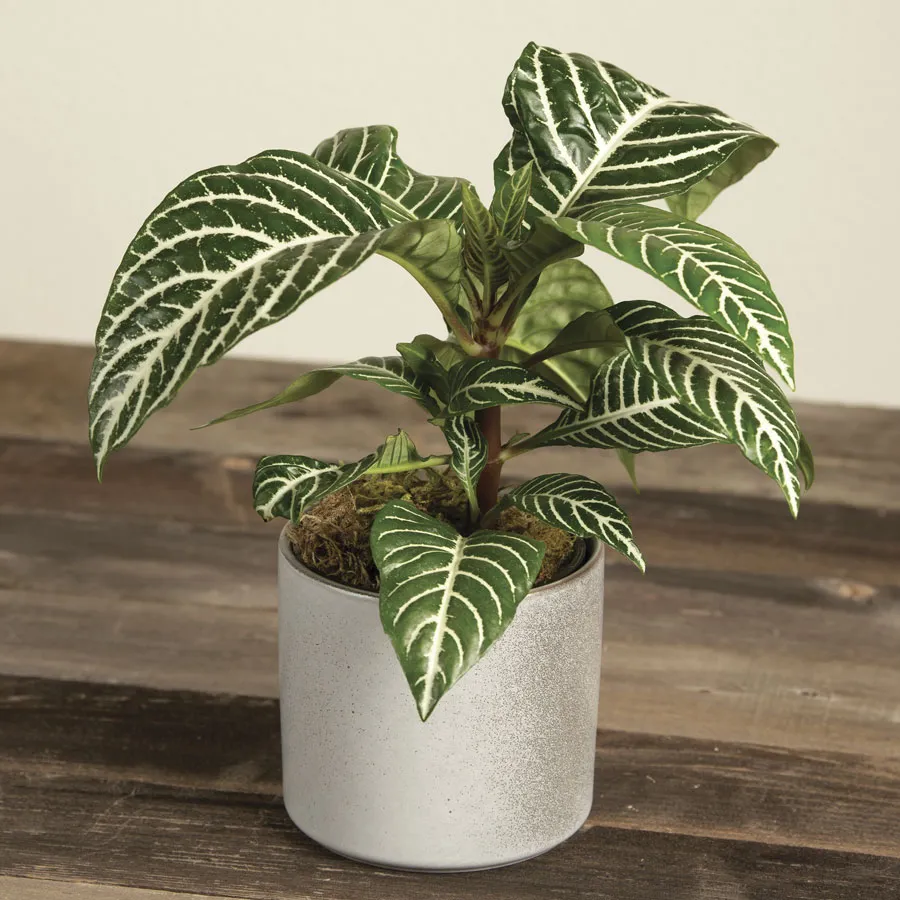 A tropical plant from Brazil, Zebra plant is widely admired and prized for its gorgeous foliage and showy flowers. Zebra plant's large, pointed leaves are a glossy dark green with bright silvery veins that create a striped appearance, hence the name! When the plant flowers, usually in the late summer or autumn, it bears a tall golden flower bract that lasts for up to six weeks. Zebra plant doesn't ask for much: just place it in bright, indirect light; water regularly with lukewarm water to keep soil temperature elevated, never allowing the soil to dry out; and mist frequently during the growing season, and you'll have a happy plant.